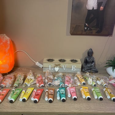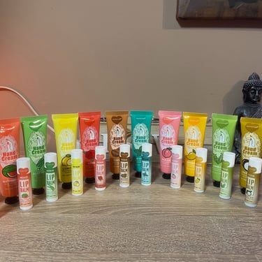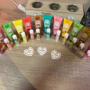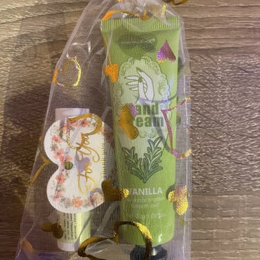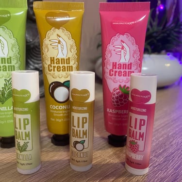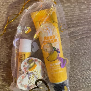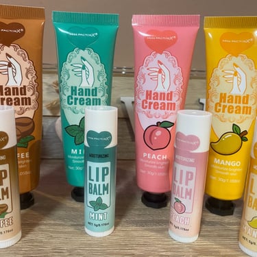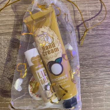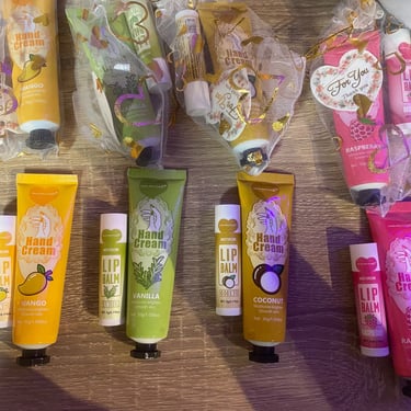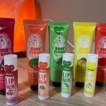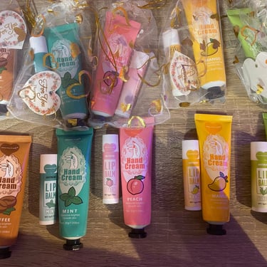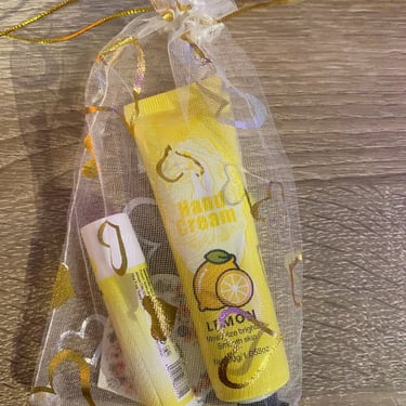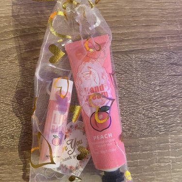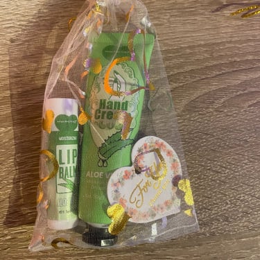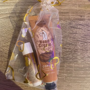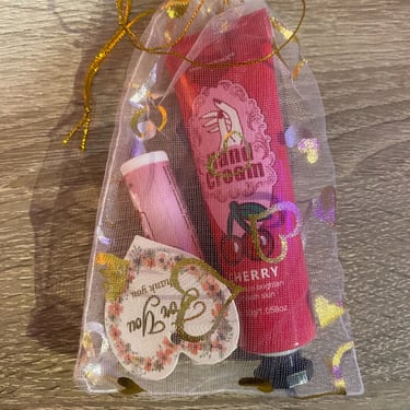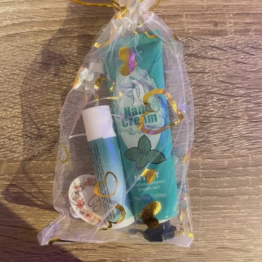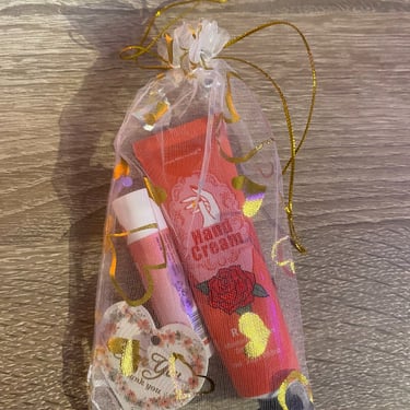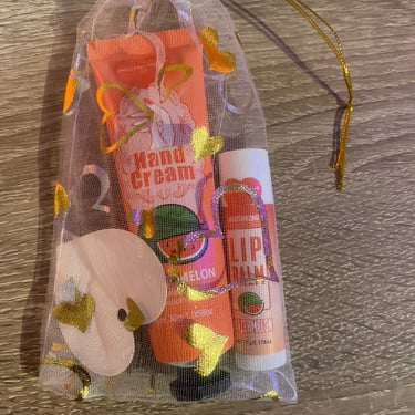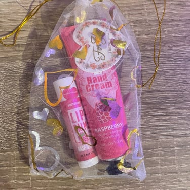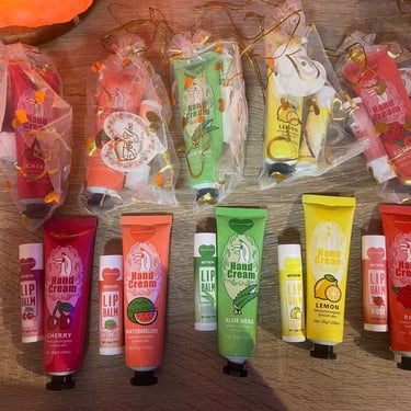Kézkrém és lips ajándékcsomag, különböző ízzel és illattal, organza tasakban és köszönőkártyával